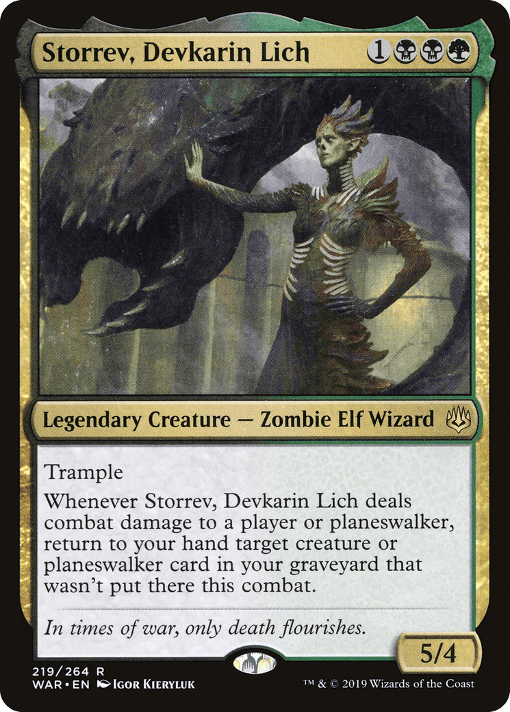 Whenever Storrev deals combat damage to a player or planeswalker, return to your hand target creature or planeswalker card in your graveyard that wasn’t put there this combat.