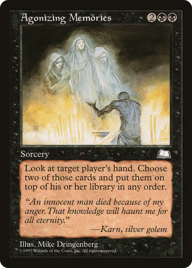 Look at target player’s hand and choose two cards from it. Put them on top of that player’s library in any order.