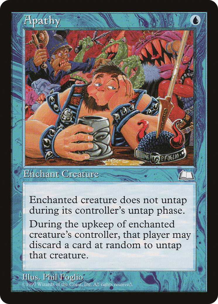 At the beginning of the upkeep of enchanted creature’s controller, that player may discard a card at random. If the player does, untap that creature.