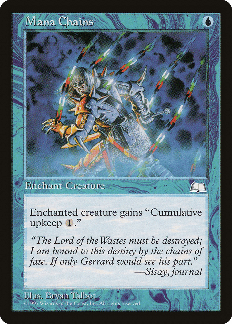 Enchanted creature has “Cumulative upkeep {1}.” (At the beginning of its controller’s upkeep, that player puts an age counter on it, then sacrifices it unless they pay its upkeep cost for each age counter on it.)