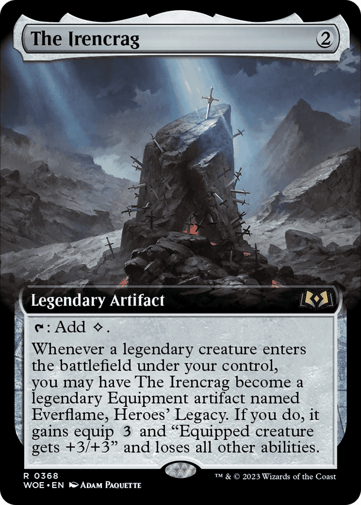 Whenever a legendary creature you control enters, you may have The Irencrag become a legendary Equipment artifact named Everflame, Heroes’ Legacy. If you do, it gains equip {3} and “Equipped creature gets +3/+3” and loses all other abilities
