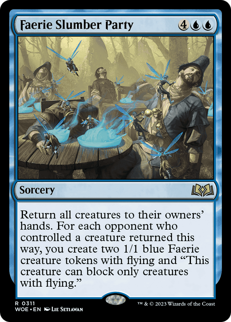 Return all creatures to their owners’ hands. For each opponent who controlled a creature returned this way, you create two 1/1 blue Faerie creature tokens with flying and “This token can block only creatures with flying.”
