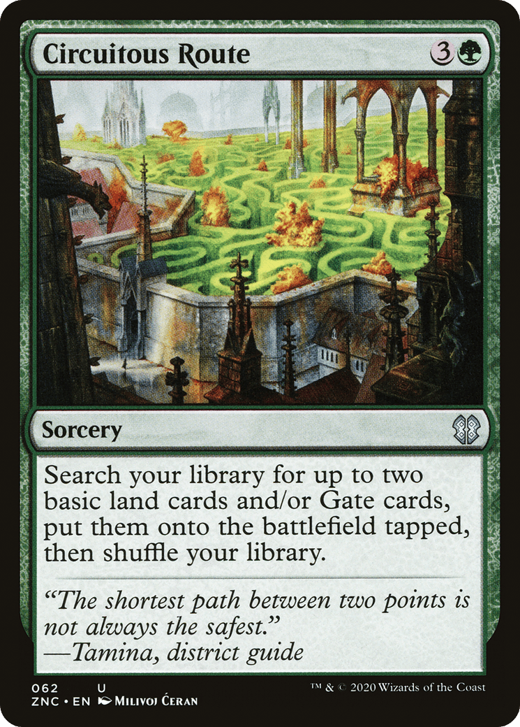 Search your library for up to two basic land cards and/or Gate cards, put them onto the battlefield tapped, then shuffle.