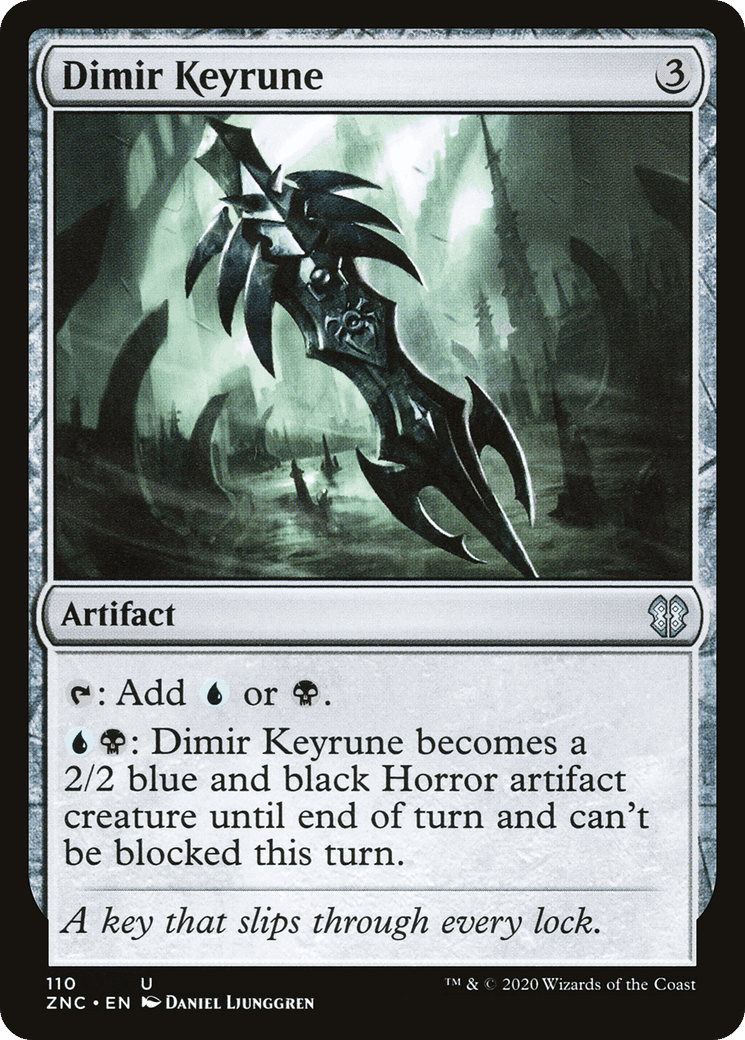 {U}{B}: This artifact becomes a 2/2 blue and black Horror artifact creature until end of turn and can’t be blocked this turn.