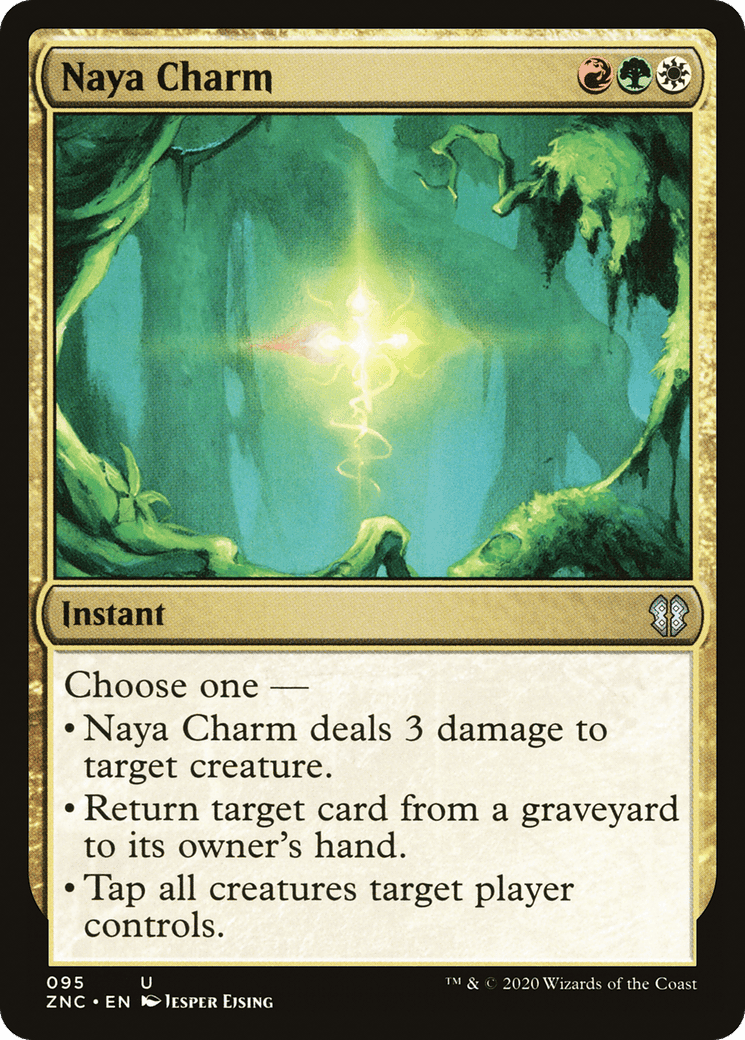 Choose one – – Naya Charm deals 3 damage to target creature. – Return target card from a graveyard to its owner’s hand. – Tap all creatures target player controls.