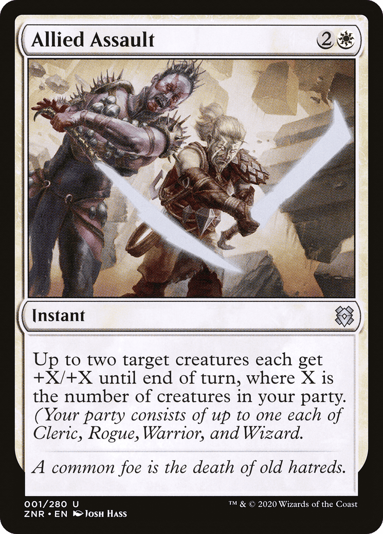 Up to two target creatures each get +X/+X until end of turn, where X is the number of creatures in your party. (Your party consists of up to one each of Cleric, Rogue, Warrior, and Wizard.)