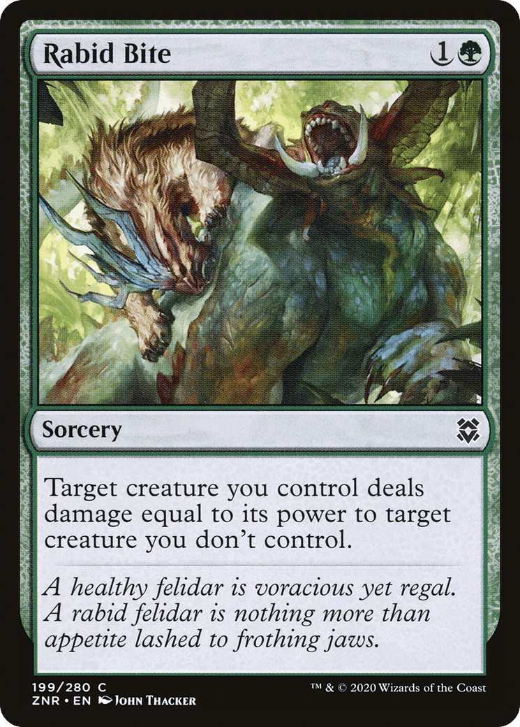 Target creature you control deals damage equal to its power to target creature you don’t control.
