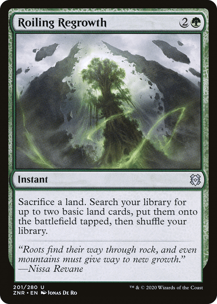 Sacrifice a land. Search your library for up to two basic land cards, put them onto the battlefield tapped, then shuffle.