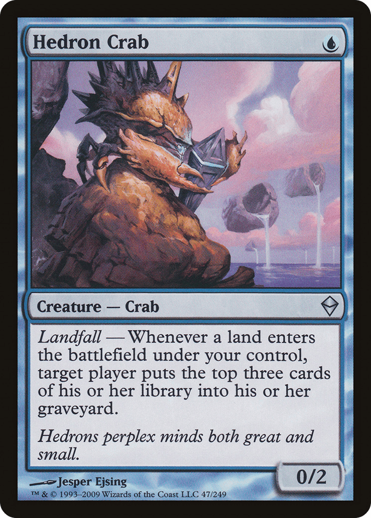 Landfall – Whenever a land you control enters, target player mills three cards. (They put the top three cards of their library into their graveyard.)