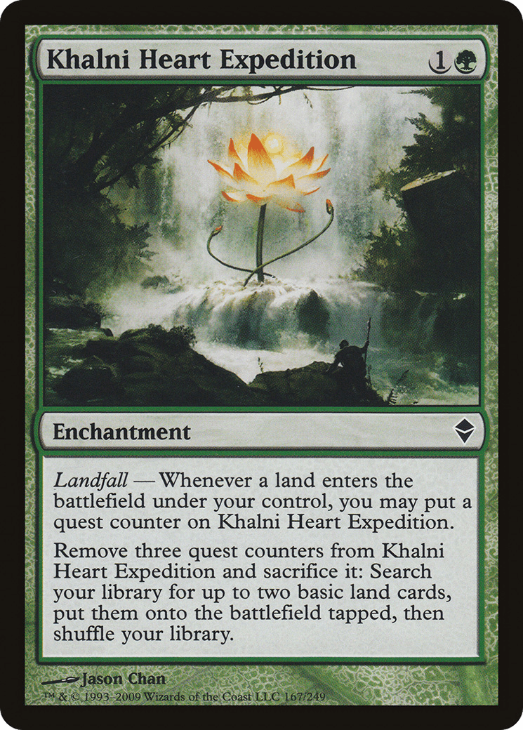 Landfall – Whenever a land you control enters, you may put a quest counter on this enchantment.